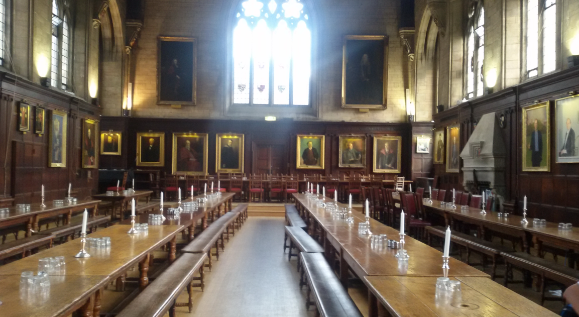 我们所到之处是牛津大学的一个学院,牛津和剑桥一样,都实行独特的学院制度。我并未留心这个学院的名字,学院古典秀丽的环境几乎占据了我所有的注意力。学院的餐厅游人如织,因为那里曾是《哈利·波特》电影的取景地。近距离感受一下,浓浓的学院氛围扑面而来,餐厅古朴典雅,四壁悬挂着牛津大学历史中著名人物的画像,营造出一种庄重的就餐氛围。