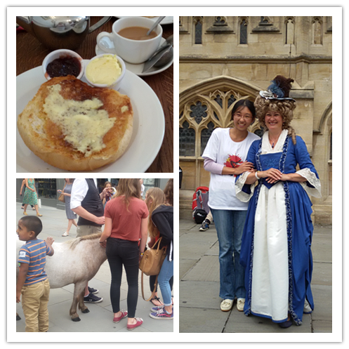午餐时间我们在有着四百多年历史的萨莉露面包房品尝了美味的法国圆面包,这家小小的面包店甚至有自己博物馆,向来往顾客展示它的历史和传统。午饭后我们被批准有一段自由活动的时间,在这段难得的时间里,我放弃了巴斯得以命名的古罗马浴池和市中央的教堂,转而走向热闹的城市广场,那里有一家挨着一家的纪念品商店和街头艺人的表演,都是我所钟爱的。要论艺术氛围,我在巴斯城市广场所见的种种,倒也和这里的乡间风格挺搭——歌手奏唱得是乡村、流行一类的音乐,画家边画边卖的是自己创作的自然风景画,还有“无源之水”行为艺术,努力让鸽子落在自己身上的小丑,牵着矮种马取悦小朋友的小贩……谈不上高雅,能让人休闲欢乐就好。轻松的城市氛围,为这个漂亮典雅的小城披上了一件休闲装。
