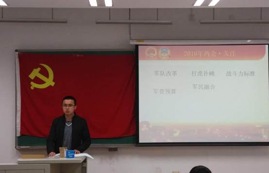 本次活动由阿依达尔和陈达两位同志担任主讲人,党支部书记崔鹤主持了活动,并从宏观上概述了两会的一些基本知识。活动开始,崔鹤同志以提问的方式介绍了关于两会的一些基本问题,如:两会的全称,召开的时间,两会的会议流程,两个“会”的区别等。让同学们对于两会有了一个概括性的,全局的把握。接下来,阿依达尔和陈达同志分别就两会中涉及军事和经济两个方面的内容进行了深入细致的讲解。阿依达尔同志为我们讲解了目前中国面临的周边安全局势,中国军区改革的意义和中国军队的战斗力现状等一系列我们平时比较关心的问题。虽然是“老话题”,但提出了很多的“新观点”。用一名退伍军人的视角来审视当今中国军队改革面临的一些问题,讲出了新意,讲出了水准。陈达同学就两会中经济的一些热点问题,如供给侧改革,扶贫与全面小康,互联网+,房地产等问题进行了深入,细致的讲解。用浅显易懂的语言,揭示了中国出台的一系列政策背后的经济学原理,并提出了一些自己的观点。让同学们对于我国近期经济领域的热点问题有了更加深入,更加透彻的了解。语言幽默生动,内容十分丰富。