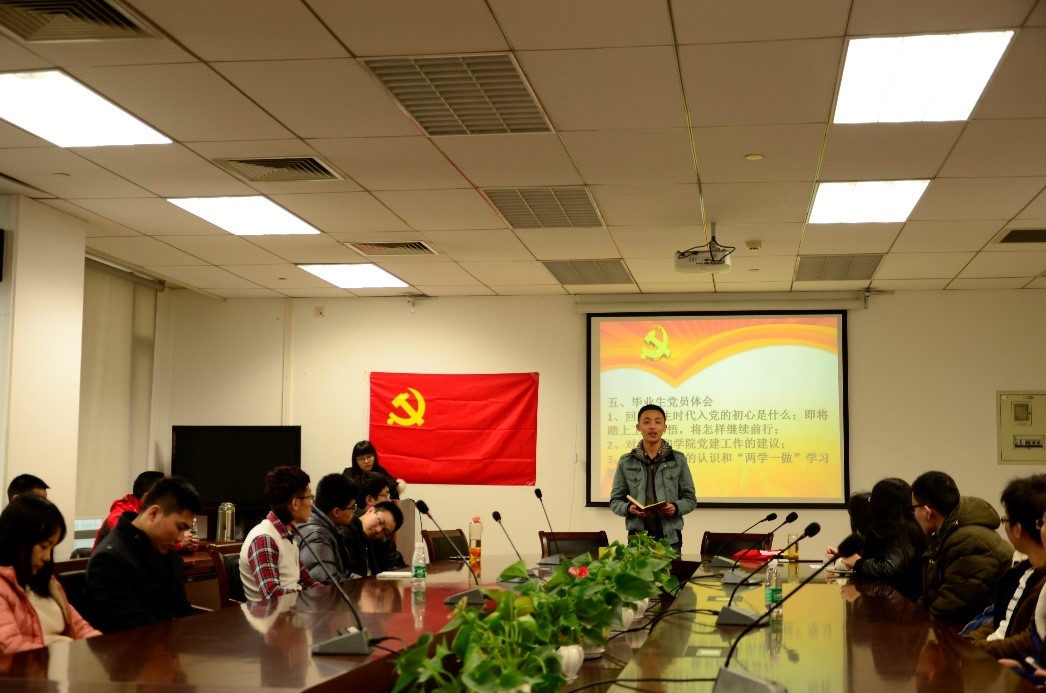 接下来,毕业班党支部回忆了从支部成立以来两年多的风风雨雨、喜乐欢愁,支部成员之间相互了解、相互学习。勿忘初心,方得始终。他们说:学生时代参加中国共产党,学习了党的光辉历史,学习了革命先烈的优秀品质,更加坚定了对中国共产党的信仰,并且在党组织生活中结识了很多优秀的朋友,像这样大家在一起参加组织活动的机会以后可能不多了。随后他们表示在以后的工作与生活中会继续学习党组织的先进思想,继续提高自身党性修养,坚持为人民服务的宗旨,始终保持共产党员的先进性,事事争先创优。