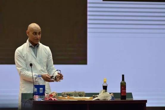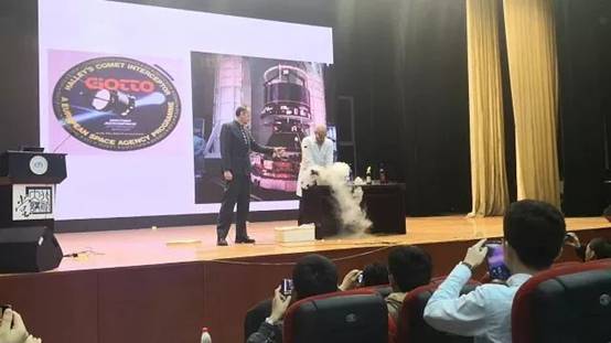 随后,奥吉哈教授为大家演示了一个“魔法”,——他要在现场制作“彗星”!他带上手套,用干冰、醇类和氨基乙酸等材料添加搅拌,俨然一副药剂师模样,短短几分钟后,这些材料最终制成一个“大圆饼”,——这便是彗星材料的理论模型。奥吉哈教授告诉大家,就如同今天制作彗星一样,我们要更努力地向太空迈进,这样才能发现它更多更神奇的奥秘。