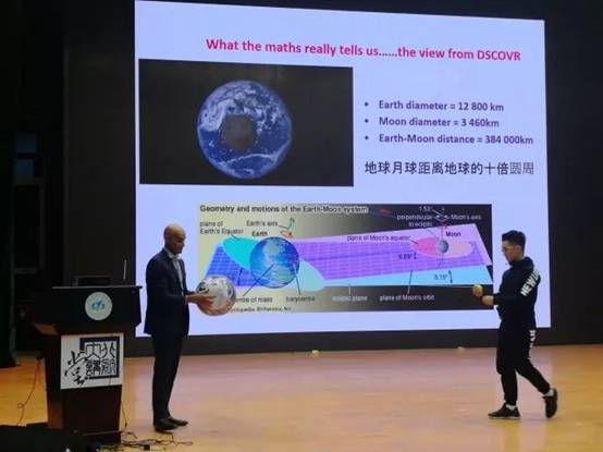 1969年,美国宇航员阿姆斯特朗第一次在月球留下人类的足迹,奥吉哈教授对这项伟业赞叹不已。“载人登月是一项极具难度的航天任务,时至今日,只有24人去过遥远的月球,其他所有人最多不过在表面附近飞行而已。”说着,奥吉哈教授捧起地球仪,地球仪上系着一根细线,细线的另一头牵在一位同学手里,细线越拉越远,一直退到了舞台的幕后角落。“这就是地月间真实的距离比例。”奥吉哈教授指了指横穿整个舞台的细线,形象地比划着登月计划实现的困难。