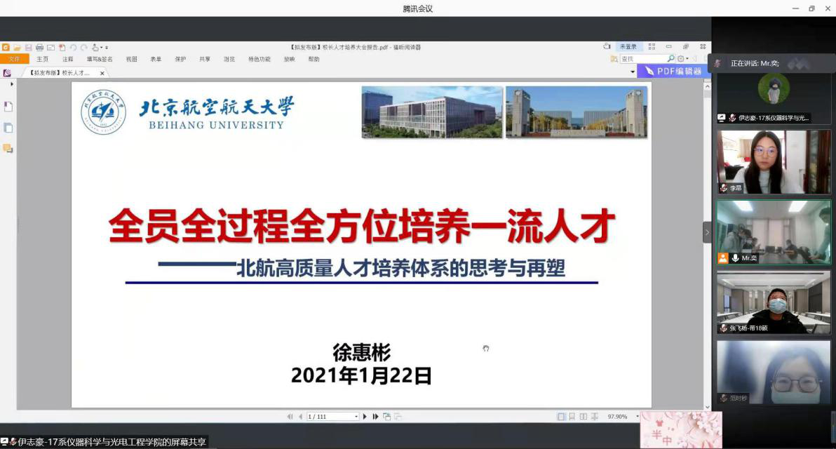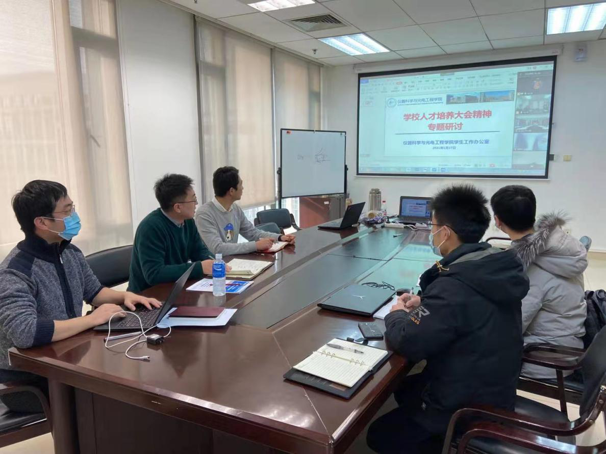 2021年1月27日下午3时,仪器科学与光电工程学院学生工作办公室全体成员以线下、线上相结合的方式,对学校人才培养大会精神进行了专题学习和研讨。本次会议由学院党委副书记金鑫老师主持。