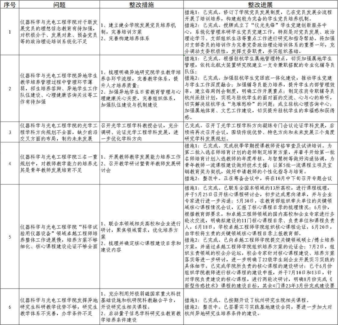 1、习近平总书记在主题教育工作会议上强调,“坚持边学习、边对照、边检视、边整改,把问题整改贯穿主题教育始终,让人民群众切实感受到解决问题的实际成效。”主题教育开展以来,仪器科学与光电工程学院始终坚持问题意识和问题导向,认真贯彻“抓好检视整改”这一主题教育重点措施,从学院工作的各个方面认真对照检查、查摆问题,具体清单及整改情况如下: