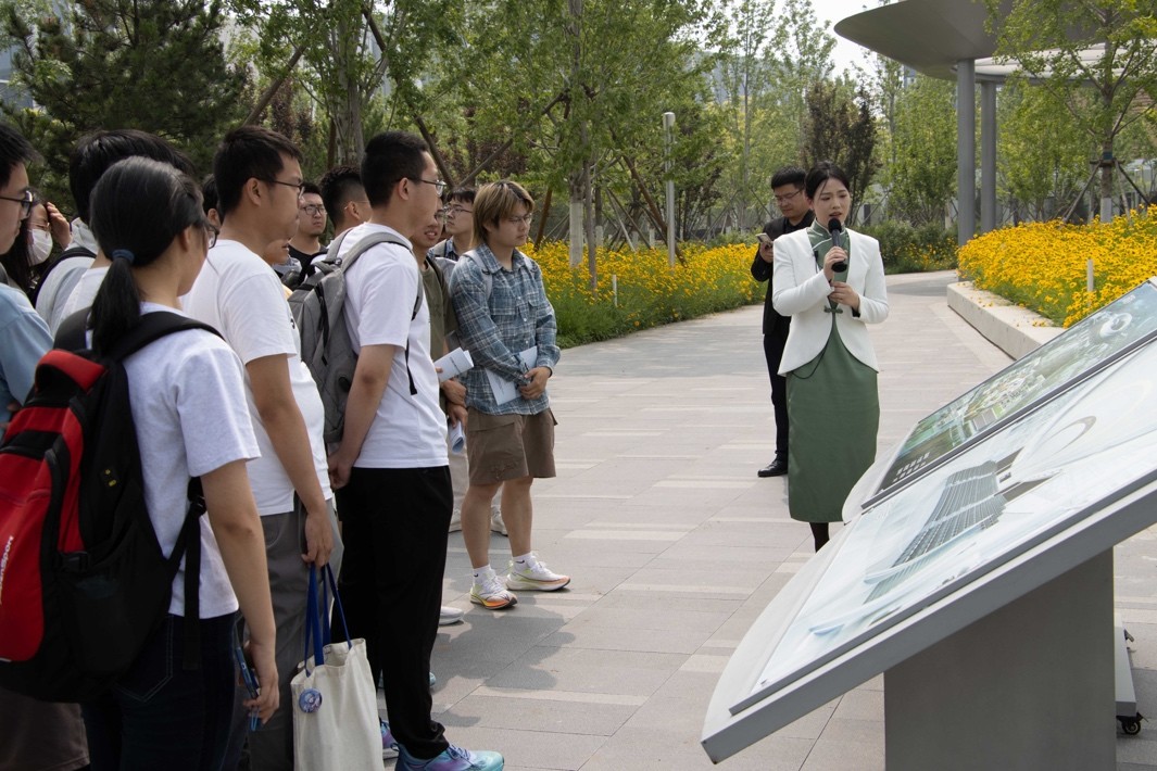 参观完物理所研究平台后,同学们继续步行到达城市客厅A地块,在学术会议厅观看了怀柔科学城宣传片,进一步了解了怀柔科学城的整体规划、理念核心和科研优势。