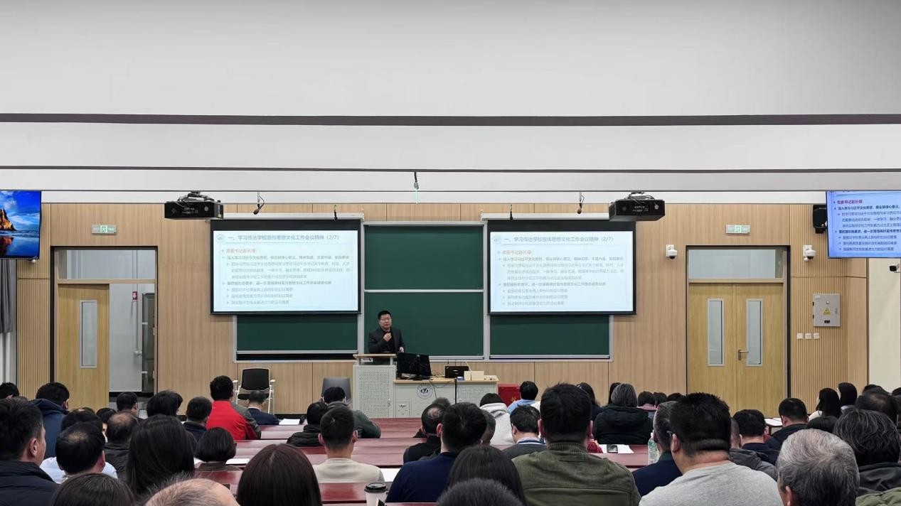 会上,学院党委书记雷晓锋介绍了会议召开的背景和主题,对会议内容要点和主要任务进行解读,结合学院实际,围绕传承弘扬以“心怀祖国、勇于创新、甘于奉献”为内核的“坚定不移、坚忍不拔、坚持不懈”的陀螺精神为主线,持续开展理论武装、“大思政”格局构建、师德师风建设、课程思政和文化建设等方面提出工作建议和思考。希望全体老师进一步提高政治站位,深入学习贯彻习近平文化思想,深刻理解学校宣传思想文化工作会议精神,弘扬教育家精神和永恒的陀螺精神,以实际行动与学校要求同频共振、同向同行。