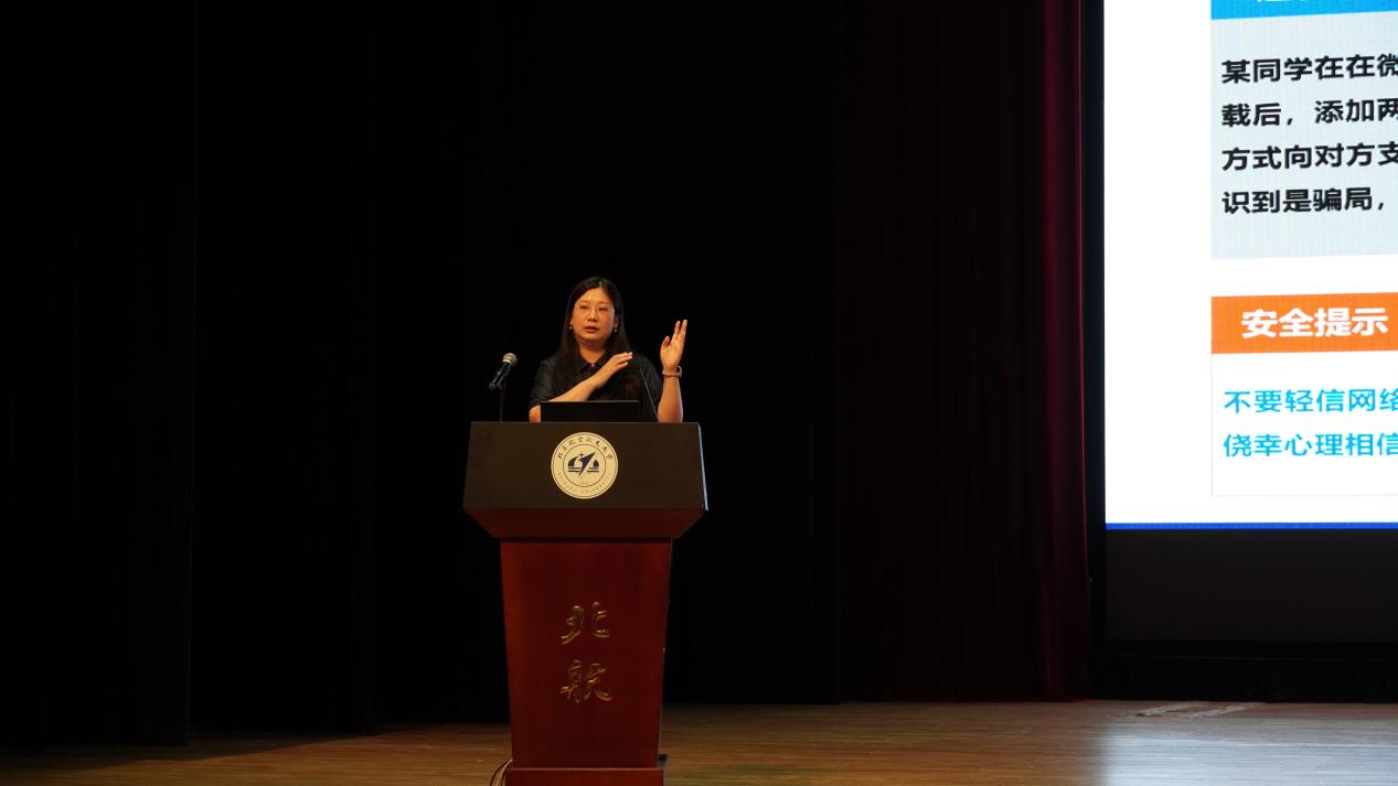学校安全保卫部交通科科长王春雪老师为大家开展安全教育,从防范电信诈骗、治安安全、交通安全等方面,提醒同学们做好校园安全,共创平安北航。