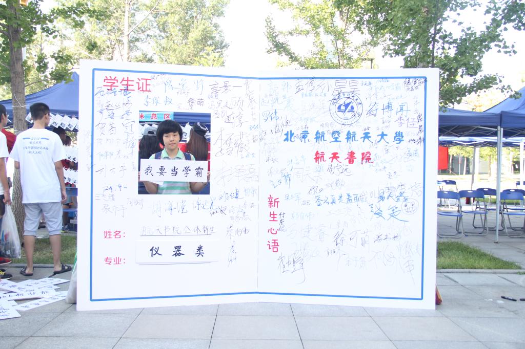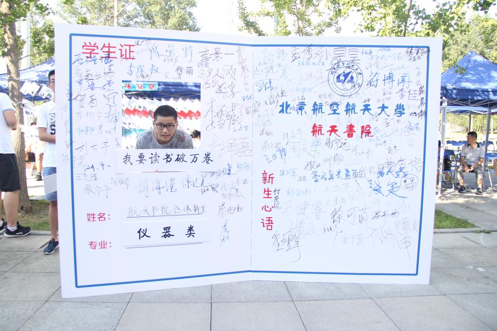 6日清晨6点,天刚刚亮,迎新工作者们就开始了一天的忙碌。迎新专刊、军训服、学生卡和学生手册......一箱箱的物资在同学们的共同努力搬运下,整齐地摞在了晨钟广场17系的报道帐篷后方。从7点开始,新生们陆续抵达学校,除了在报到处领取物资,同学们还纷纷在航天书院的特色照片墙上签名、拍照留念,形成了一道亮丽的风景线。
