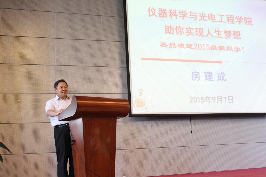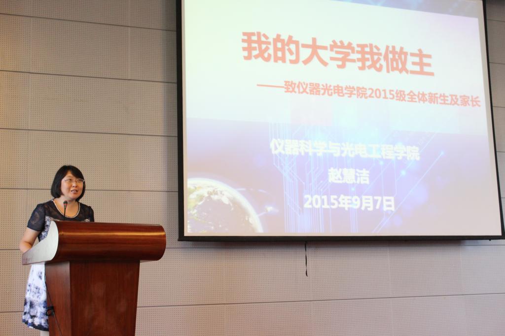 7日下午1点,仪器科学与光电工程学院2015级新生开学典礼在实验楼4号楼205举行,学院的领导老师、各位辅导员、2015级全体新生和部分家长参加了开学典礼。赵剡老师代表学院全体教师在大会上致辞,齐启超同学和马微微同学分别代表14级老生和15级新生在大会上发言。学院党委书记赵慧洁教授在大会上致辞,赵书记指出大学里充满了各种选择,并鼓励新生们要在大学学会独立,找到属于自己的幸福。最后学院院长房建成教授在大会上致辞,为新生和家长们讲述了学院的发展历史,还鼓励新生要时刻抱有积极进取的心态,不要虚度每一分光阴,不要放弃每一个机遇,努力开拓属于自己的大学生活。