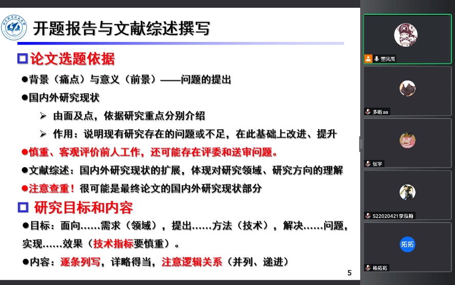2022年11月2日晚19:30,由仪器科学与光电工程学院研究生会主办的“硕士研究生开题指导与经验分享会”在新主楼B707举行,腾讯会议线上同步进行。