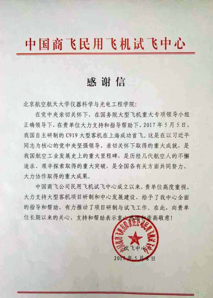 2017年5月8日,中国商飞民用飞机试飞中心发来感谢信,对学院为C919成功首飞所做的工作表示感谢。全文如下: